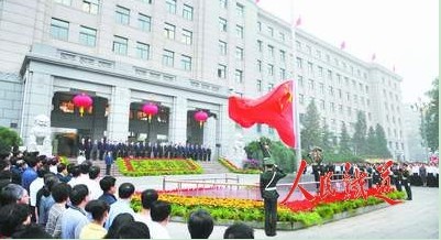 今天,鐵道部在機(jī)關(guān)大樓前隆重舉行升旗儀式,慶祝新中國(guó)60華誕。8時(shí)10分,在雄壯的國(guó)歌聲中,鮮艷的五星紅旗徐徐升起。圖為鐵道部黨組成員及部機(jī)關(guān)全體人員莊嚴(yán)地向國(guó)旗行注目禮,用這種方式祝福祖國(guó)繁榮昌盛。